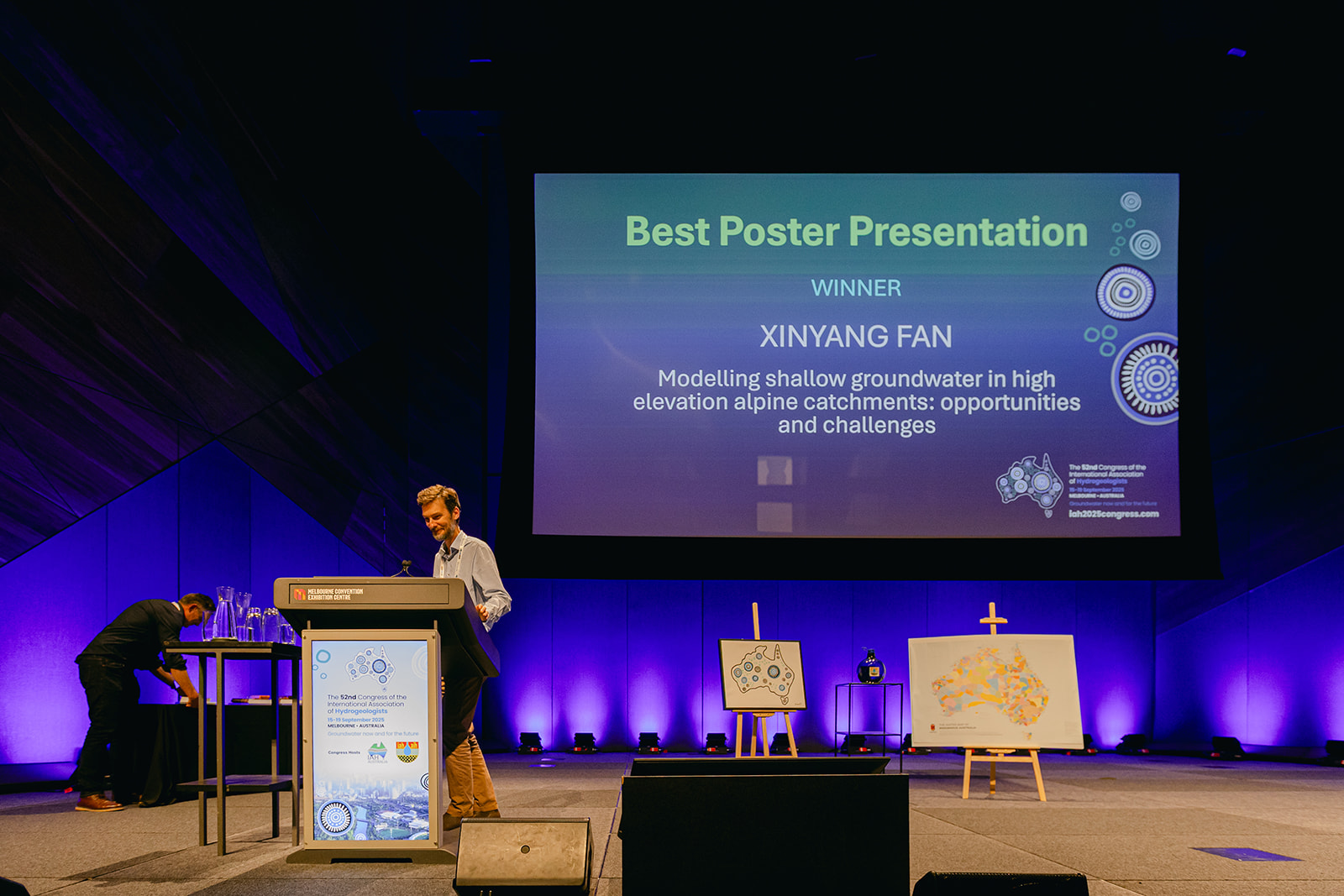 Dr. Xinyang Fan (FAU Erlangen/Uni Bern) was awarded the Best Poster Presentation by the International Association of Hydrogeologists (IAH) at the World Groundwater Congress 2025 in Melbourne, Australia. Her work, “Modelling shallow groundwater in high-elevation alpine catchments: opportunities and challenges”, was recognized for valuable new insights into groundwater and discharge dynamics in the high-elevation glaciated landscapes. It highlights both the potential and complexities of physics-based hydrological modeling in such sensitive environments. This prize emphasizes the significance of investigating and understanding the changes in the high alpine geosystems under the impact of climate change.